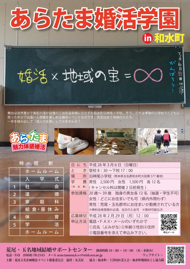 2016.02.02 2016.09.05 自治体の婚活事業aikumamed 【3/6(日)和水町】あらたま婚活学園 in 和水町 ツイート シェア はてブ 送る Pocket 平成28年3月6日(日曜日) 主催者:荒尾玉名企画婚活イベント推進委員会(荒尾・玉名地域結婚サポートセンター) イベント名:あらたま婚活学園 in 和水町 場所:和水町(旧神尾小学校) イベントチラシ